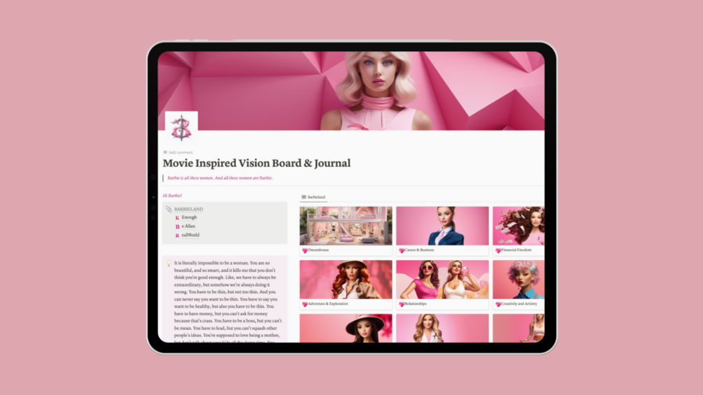 The Notion Movie Inspired Vision Board and Journal template stands as the ultimate companion for women on their journey through life. Secure your copy today and begin envisioning every intricate detail.