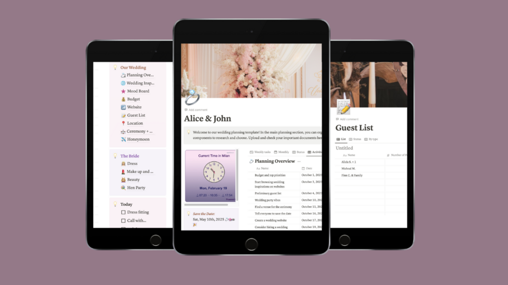 Why waste time and energy on complicated planning methods when you can have everything you need in one beautifully designed Notion template? A customizable, portable and easy to use digital wedding planner. Purchase your copy today and start planning your perfect day with confidence and ease.